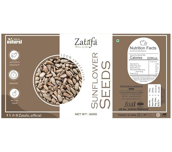 ZATAFA Sunflower Seeds are 100% raw, unroasted, and natural, offering a nutrient-rich addition to your daily meals and snacks. Packed with plant-based protein and vitamin E, these seeds are well-suited for those who prefer clean, simple, and wholesome food options. Their mild, nutty flavor and crunchy texture make them ideal for topping salads, blending into smoothies, baking healthy bars, or enjoying as a light snack. Sunflower seeds are appreciated for their natural nutrient content that fits into mindful and balanced eating. These seeds can be easily incorporated into a wide range of recipes, both sweet and savory, adding nutrition and taste without the need for roasting or processing. Stored in a 200g pack, they stay fresh and ready to use. Whether added to breakfast bowls, mixed into trail mixes, or used in homemade granola, ZATAFA sunflower seeds offer culinary flexibility with nutrition. Sourced with care and free from additives, these seeds support a kitchen lifestyle focused on real, natural ingredients. Best stored in a cool, dry place to maintain freshness and crunch.